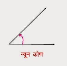 न्यून कोण (Acute Angle) :- ऐसा कोण जो शून्य अंश से बड़ा परन्तु 90 अंश से छोटा हो न्यूनकोण कहलाता है। ऐसा कोण जिसे बनाने वाली दोनों किरणों के मध्य का झुकाव 90 अंश से कम और 0 अंश से अधिक हो न्यून कोण कहलाता है|